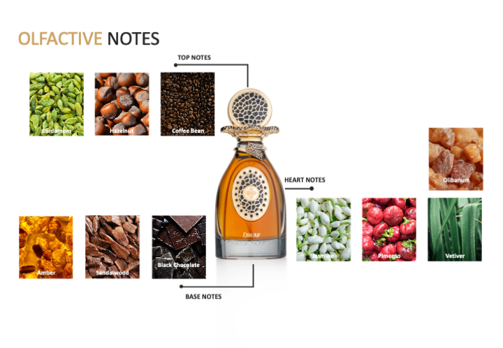 Dhuaf unveils with a warm blend of cardamom, roasted hazelnut, and coffee bean, evolving into a heart of jasmine, pimento, vetiver, and smoky olibanum. The base lingers with mooth amber, creamy sandalwood, and a touch of black chocolate, leaving behind a velvety richness that is as luxurious as it is daring.